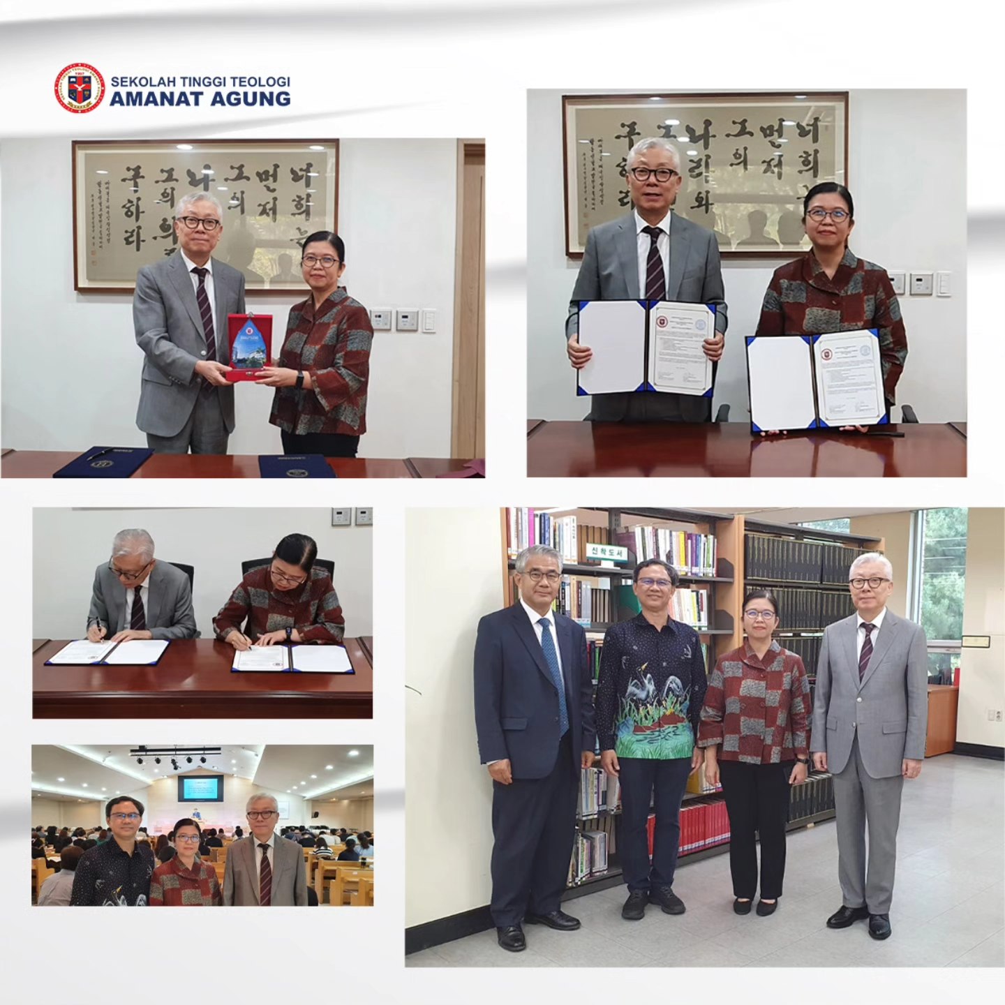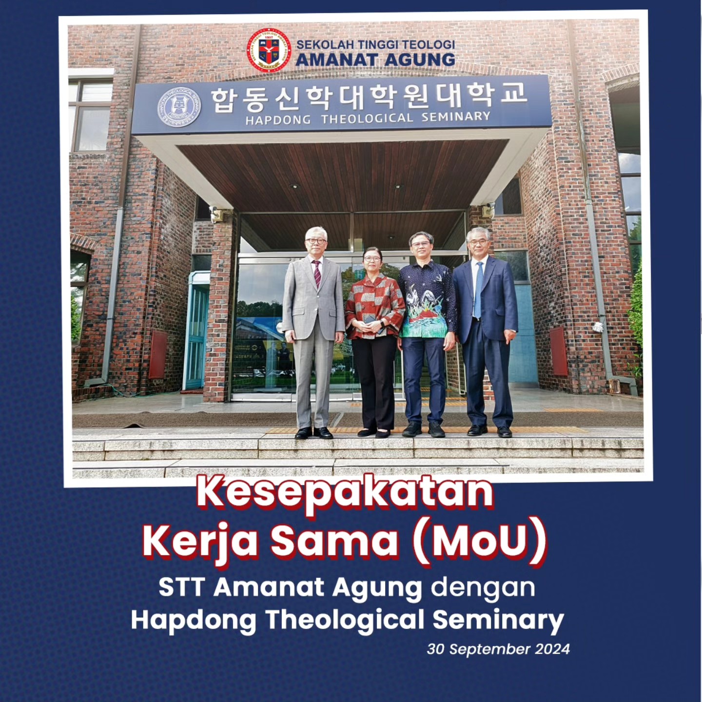 Pada Senin, 30 September 2024, STT Amanat Agung dan Hapdong Theological Seminary bersepakat melakukan kerja sama. Memorandum of Understanding (MoU) ditandatangani oleh Ketua STT Amanat Agung, Pdt. Casthelia Kartika, D.Th., dan Presiden Hapdong Theological Seminary, Rev. Dr. Hark Yoo Kim, di kampus Hapdong Theological Seminary, Suwon, Korea Selatan. Kiranya kerja sama ini semakin mengembangkan pelayanan masing-masing institusi.